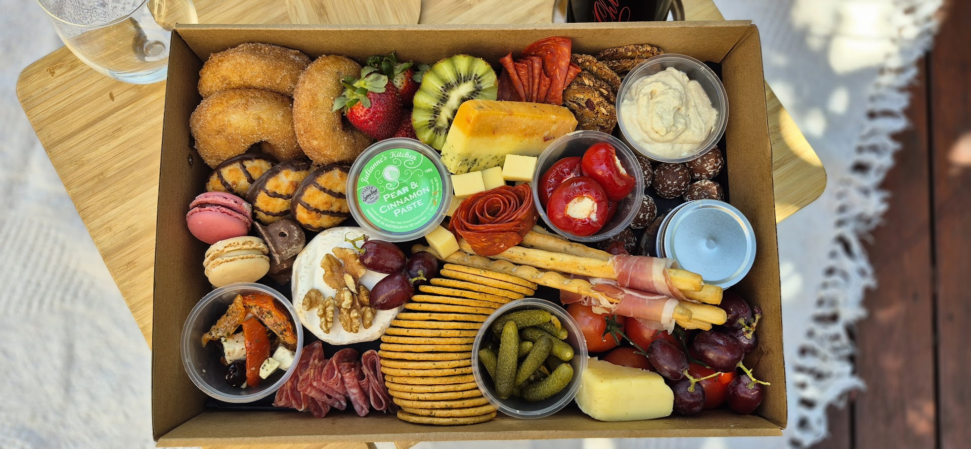Includes grazing goodies such as gourmet cheeses (3-5 types of cheese), cured meats, dips, pâte, antipasto, seasonal fruit and veg, crackers, nuts and a variety of sweets.